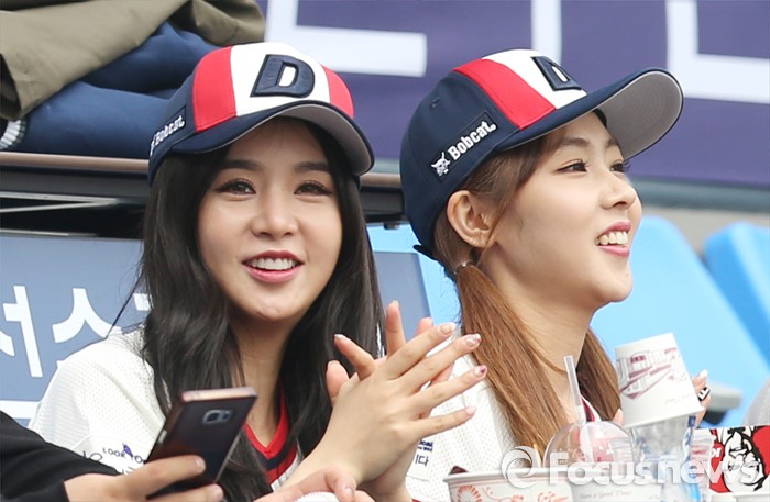 (서울=포커스뉴스) 10일 서울 잠실구장에서 열린 2016 프로야구 넥센-두산 경기에서 시구한 걸그룹 피에스타의 차오루(왼쪽)와 혜미가 응원단의 음악에 맞춰 박수를 치며 경기를 관전하고 있다.