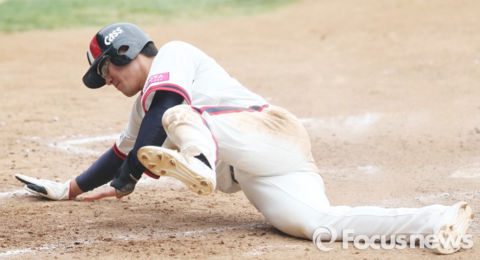 (서울=포커스뉴스) 10일 서울 잠실구장에서 열린 2016 프로야구 넥센-두산 경기 4회말 2사 만루에서 두산 정수빈의 내야안타때 2루주자 김재호가 슬라이딩하며 홈인하고 있다.