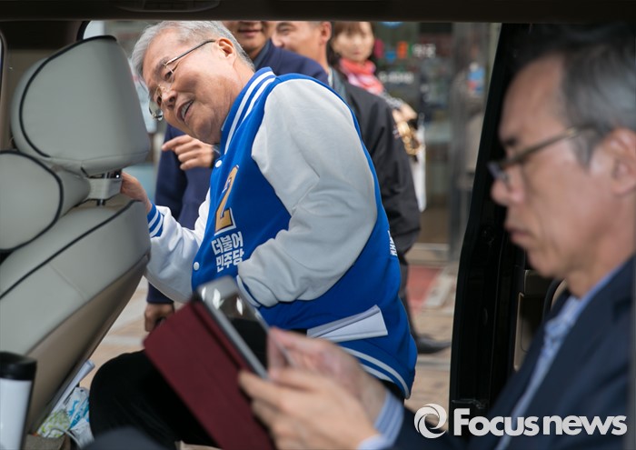 (용인=포커스뉴스) 10일 오후 경기도 기흥구청 인근 거리에서 김민기 더불어민주당 용인을 후보의 지원유세를 마친 김종인 비대위 대표 겸 선대위원장이 차량에 오르고 있다. 오른쪽은 주진형 국민경제상황실 부실장.