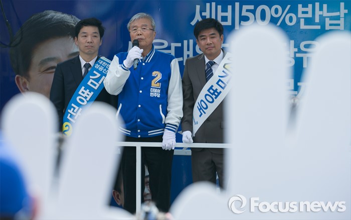 (성남=포커스뉴스) 10일 오후 경기도 성남 미금역 앞에서 열린 더불어민주당 분당 합동유세에 참석한 김종인(가운데) 비대위 대표 겸 선대위원장과 김병관(왼쪽) 분당갑, 김병욱 분당을 후보의 지지를 호소하고 있다.