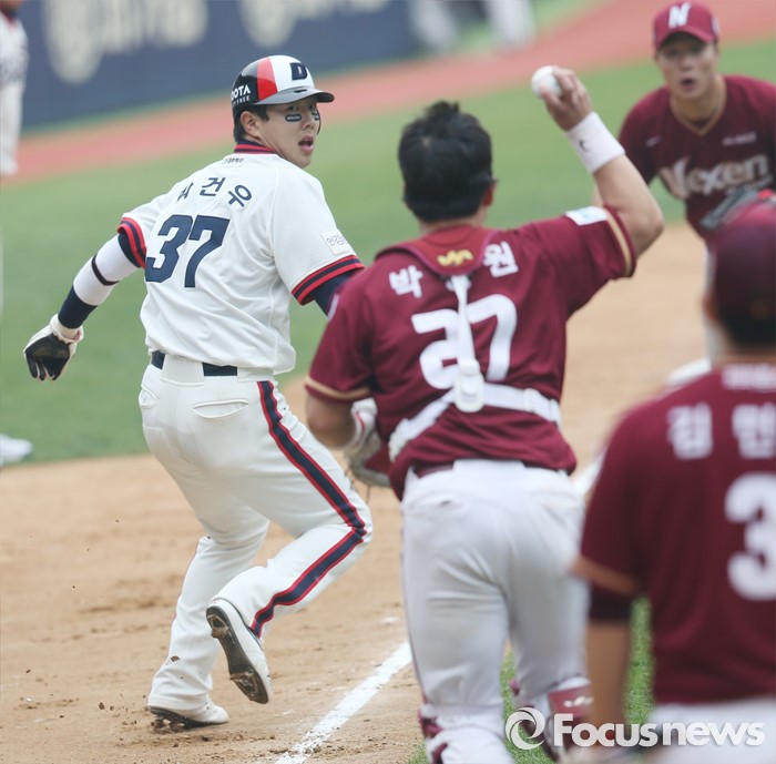 (서울=포커스뉴스) 10일 서울 잠실구장에서 열린 2016 프로야구 넥센-두산 경기 6회말 1사 3루에서 두산 허경민의 3루 땅볼때 3루주자 박건우가 협살에 걸려 아웃되고 있다.