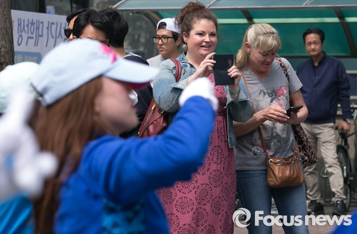 (성남=포커스뉴스) 10일 오후 경기도 성남 미금역 앞에서 외국인 관광객들이 더불어민주당 분당 합동유세를 촬영하고 있다.