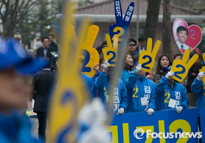 (용인=포커스뉴스) 10일 오후 경기도 기흥구청 인근 거리에서 김민기 더불어민주당 용인을 후보의 선거운동원들이 지지를 호소하고 있다.