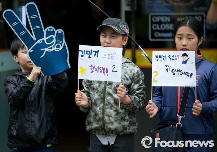 (용인=포커스뉴스) 10일 오후 경기도 기흥구청 인근 거리에서 어린이들이 김민기 더불어민주당 용인을 후보의 지지를 호소하고 있다.