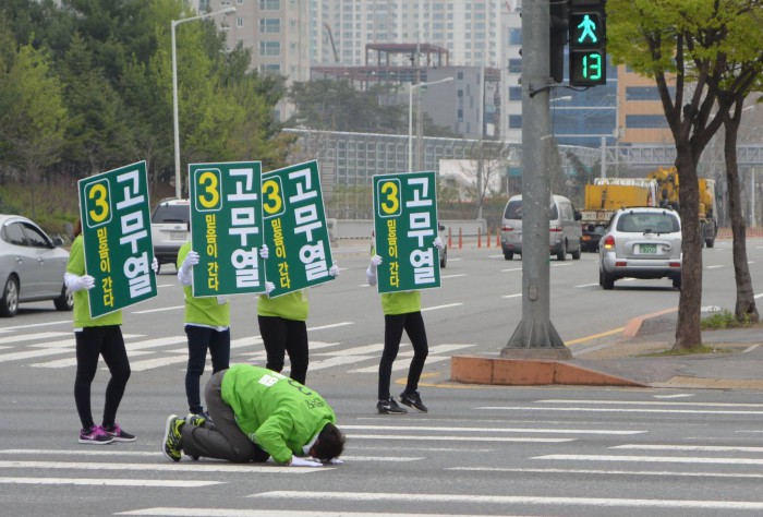 고무열 후보는 또 "조금만 도와주시면 승리가 보인다"면서 지지를 호소했다.고무열 국민의당 후보가 도로에서 큰 절을 올리는 모습. <출처 = 고무열 후보 페이스북>
