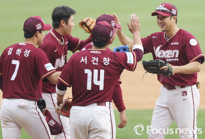 (서울=포커스뉴스) 10일 서울 잠실구장에서 열린 2016 프로야구 넥센-두산 경기에서 두산에 역전승한 넥센 선수들이 마운드에 모여 하이파이브를 하며 승리의 기쁨을 나누고 있다.