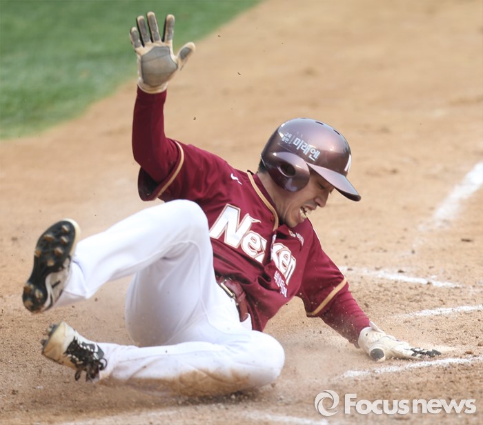(서울=포커스뉴스) 10일 서울 잠실구장에서 열린 2016 프로야구 넥센-두산 경기 8회초 1사 만루에서 넥센 3루 대주자 박정음이 김하성의 우익수 희생플라이때 홈에서 슬라이딩하며 세이프되고 있다.