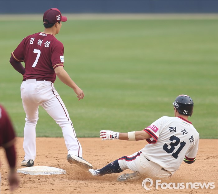 (서울=포커스뉴스) 10일 서울 잠실구장에서 열린 2016 프로야구 넥센-두산 경기 9회말 2사후 두산 정수빈이 우중간 안타를 치고 2루에서 세이프되고 있다.