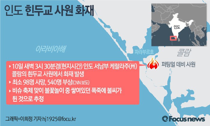 (서울=포커스뉴스) CNN보도에 따르면 인도 서남부 케랄라주의 한 힌두교 사원에서 10일(현지시간) 새벽 큰불이 나 98명이 숨지고 540명 이상 크게 다쳤다.