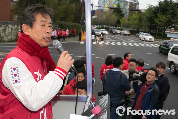 (울산=포커스뉴스) 11일 오전 울산시 동구 현대중공업 앞에서 안효대 새누리당 울산 동구 후보가 유세를 하고 있다.