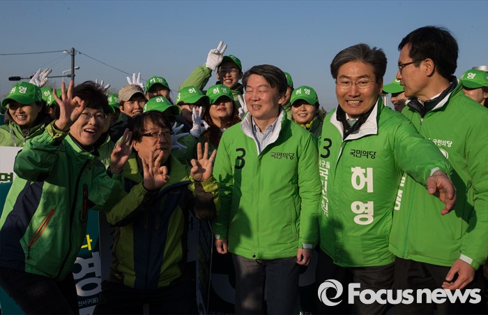 (인천=포커스뉴스) 안철수 국민의당 상임공동대표가 11일 아침 인천시 서구 검암역에서 인천 서구을 허영 후보와 기념사진을 찍고 있다.
