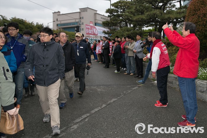 (울산=포커스뉴스) 김무성(오른쪽) 새누리당 대표가 11일 오전 울산시 동구 현대중공업 앞에서 안효대 울산 동구 후보 지원유세를 하고 있다.