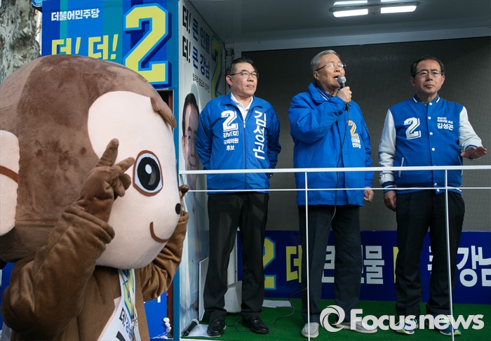 (서울=포커스뉴스) 20대 총선을 이틀 앞둔 11일 오전 서울 지하철 선릉역 인근 거리에서 김종인(가운데) 더불어민주당 비대위 대표 겸 선대위원장이 김성곤(오른쪽) 강남갑 후보의 지지를 호소하고 있다.