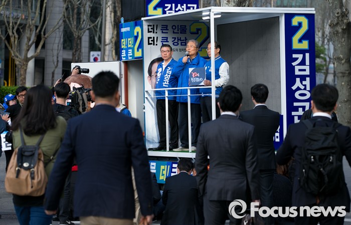 (서울=포커스뉴스) 20대 총선을 이틀 앞둔 11일 오전 서울 지하철 선릉역 인근 거리에서 김종인(가운데) 더불어민주당 비대위 대표 겸 선대위원장이 김성곤(오른쪽) 강남갑 후보의 지지를 호소하고 있다.