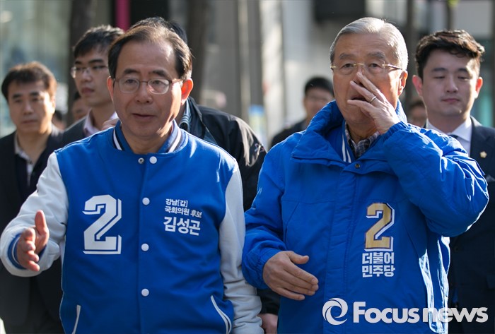 (서울=포커스뉴스) 20대 총선을 이틀 앞둔 11일 오전 서울 지하철 선릉역 인근 거리에서 투표참여 캠페인을 마친 김종인(가운데) 더불어민주당 비대위 대표 겸 선대위원장이 김성곤(왼쪽) 강남갑 후보의 지원유세를 위해 이동하고 있다.