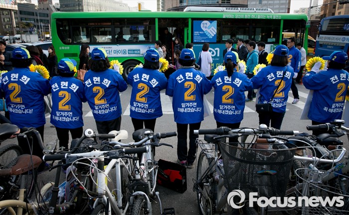 (서울=포커스뉴스) 20대 총선을 이틀 앞둔 11일 오전 서울 지하철 수서역 인근 거리에서 전현희 더불어민주당 강남을 후보의 선거운동원들이 지지를 호소하고 있다.