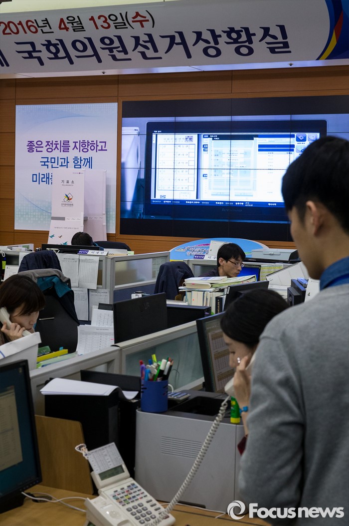 (과천=포커스뉴스) 4.13 총선을 이틀 앞둔 11일 오전 경기 과천 중앙선거관리위원회 내 제20대 국회의원선거상황실에서 선관위 직원들이 분주히 움직이고 있다.