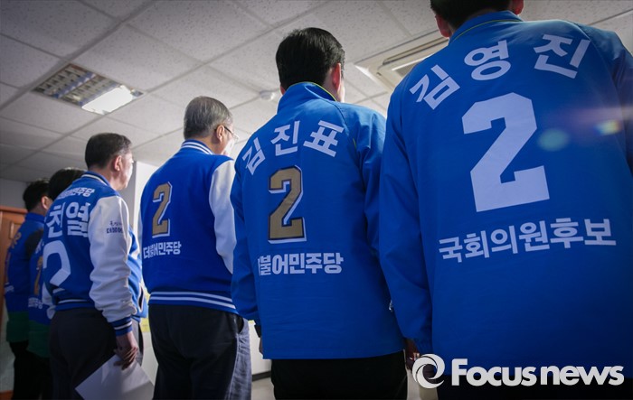 (수원=포커스뉴스) 20대 총선을 이틀 앞둔 11일 오전 수원 장안구 더불어민주당 경기도당 회의실에서 김종인 비대위 대표 겸 선대위원장이 수원 후보들과 대국민 성명 발표를 하고 있다.