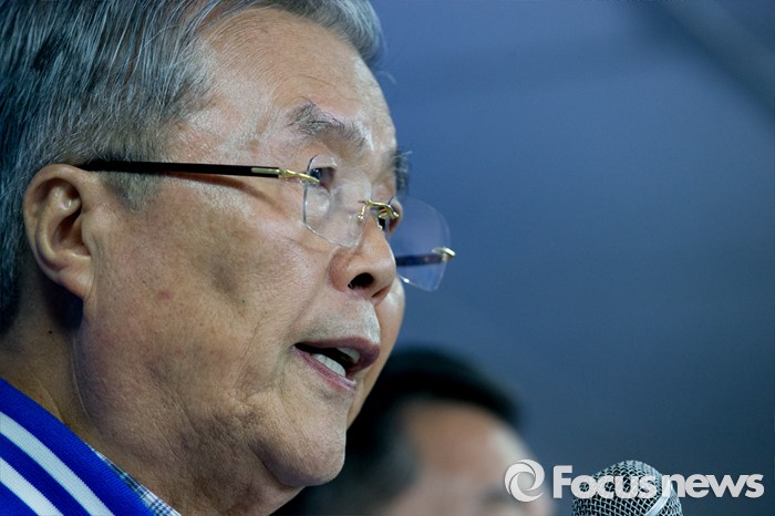 (수원=포커스뉴스) 20대 총선을 이틀 앞둔 11일 오전 수원 장안구 더불어민주당 경기도당 회의실에서 김종인 비대위 대표 겸 선대위원장이 수원 후보들과 대국민 성명 발표를 하고 있다.