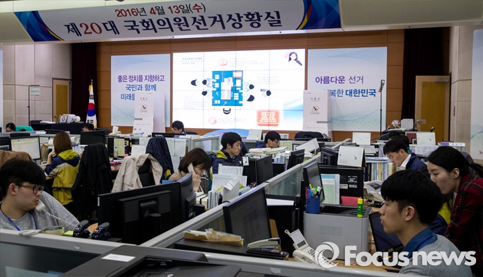 (과천=포커스뉴스) 4.13 총선을 이틀 앞둔 11일 오전 경기 과천 중앙선거관리위원회 내 제20대 국회의원선거상황실에서 선관위 직원들이 분주히 움직이고 있다.