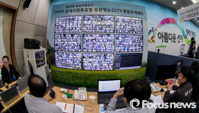 (과천=포커스뉴스) 4.13 총선을 이틀 앞둔 11일 오전 경기 과천 중앙선거관리위원회 내 관내사전투표함 보관장소 CCTV통합관제센터에서 선관위 관계자들이 실시간으로 투표함을 감시하고 있다.