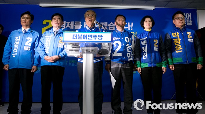 (수원=포커스뉴스) 20대 총선을 이틀 앞둔 11일 오전 수원 장안구 더불어민주당 경기도당 회의실에서 김종인 비대위 대표 겸 선대위원장이 수원 후보들과 대국민 성명 발표를 하고 있다. 왼쪽부터 김영진 수원병, 김진표 수원무 후보, 김 대표, 이찬열 수원갑, 백혜련 수원을, 박광온 수원정 후보.