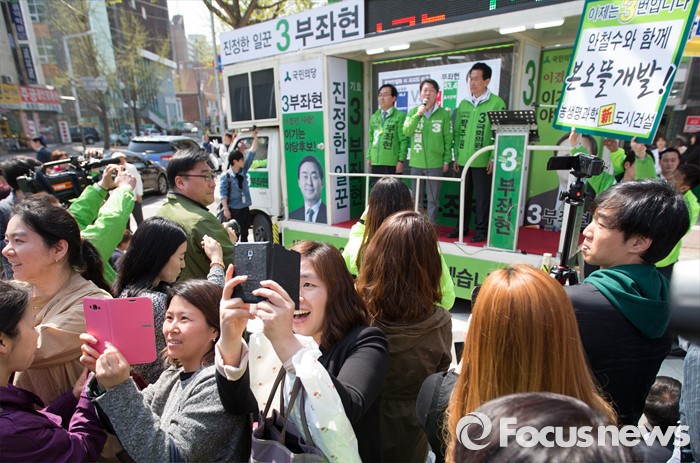 (안산=포커스뉴스) 안철수 국민의당 상임공동대표(가운데)가 11일 오전 안산시 단원구 고잔성당 사거리에서 부좌현 안산시 단원구을 후보 지원유세를 하고 있는 가운데 유권자들이 기념사진을 찍고 있다.