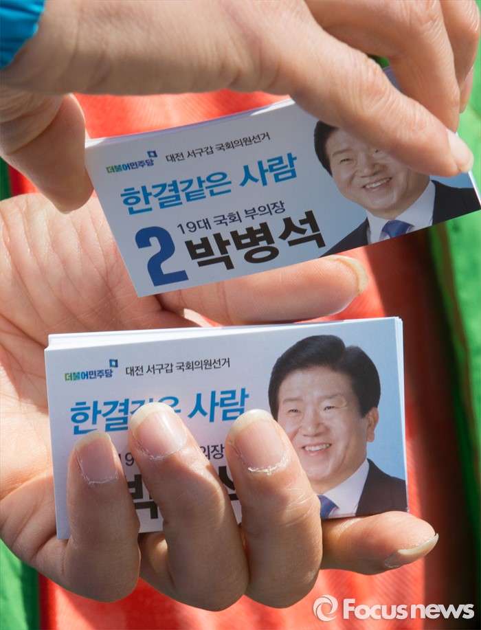 (대전=포커스뉴스) 20대 국회의원 선거를 이틀 남긴 11일 오전 대전 서구 흑석네거리에서 박병석 더불어민주당 후보 선거운동원이 시민들에게 명함홍보물을 나눠주고 있다.