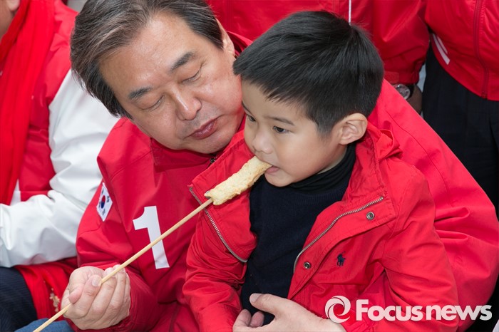 (부산=포커스뉴스) 제20대 총선에서 부산 중구영도에 출마한 김무성(왼쪽) 새누리당 대표가 11일 오후 부산 중구 국제시장 먹자골목 좌판 음식점에 앉아, 손자에게 어묵을 먹여주고 있다.