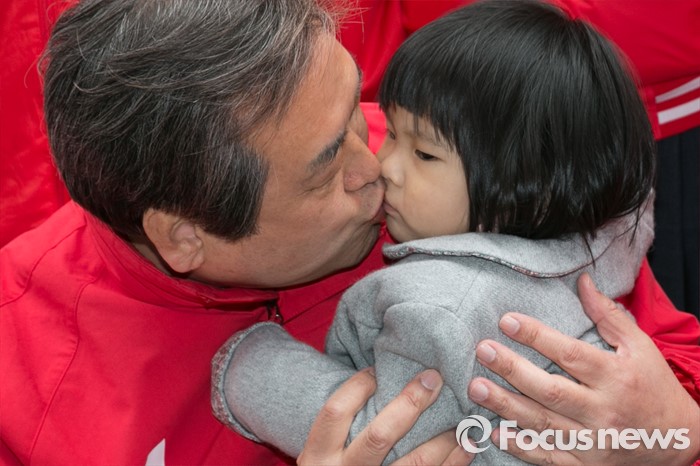 (부산=포커스뉴스) 제20대 총선에서 부산 중구영도에 출마한 김무성 새누리당 대표가 11일 오후 부산 중구 국제시장 먹자골목 좌판 음식점에 앉아, 손녀에게 뽀뽀를 하고 있다.