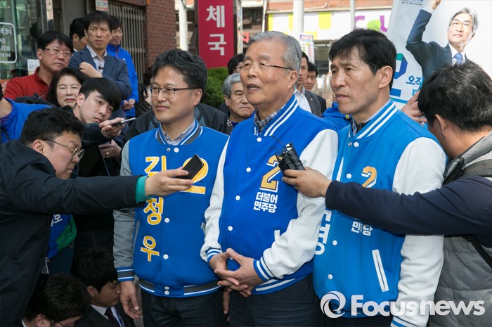 (군포=포커스뉴스) 20대 총선을 이틀 앞둔 11일 오후 경기도 군포 당동우체국 사거리에서 열린 더불어민주당 군포지역 합동유세에 참석한 김종인(가운데) 비대위 대표 겸 선대위원장이 김정우(왼쪽) 군포갑, 이학영 군포을 후보와 함께 취재진 질문에 답하고 있다.
