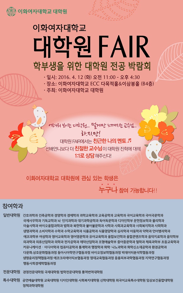 대학원 FAIR는 학부 재학생·미취업 졸업생을 대상으로 이화여대 대학원 진학을 위한 정보를 제공하는 행사로 2011학년도 1학기부터 매 학기마다 진행되고 있다.