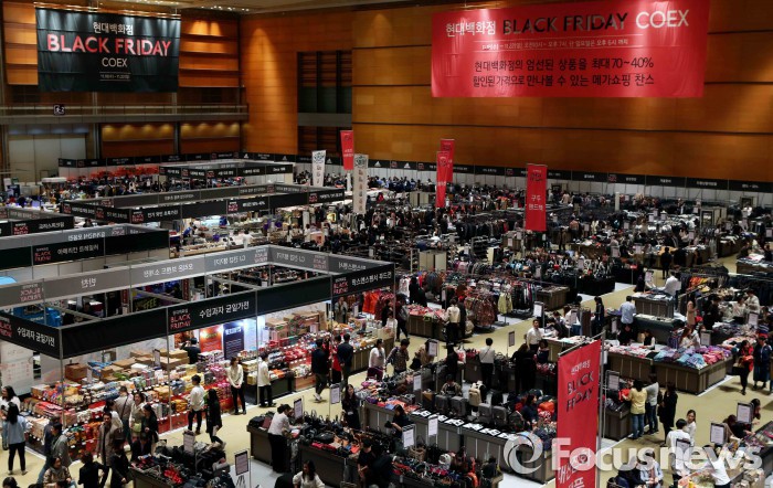 정지영 현대백화점 영업전략실장은 “가족 단위 방문객들이 많이 찾는 상품군의 할인율을 높이는 등 차별화된 행사 기획을 통해 협력사 재고 부담을 해소하고, 내수 활성화를 위해 파격적인 할인 행사를 준비했다”고 말했다.2015년 삼성동 코엑스에서 열린 현대백화점 블랙프라이데이 행사장에서 소비자들이 물건을 고르고 있다.<사진제공=현대백화점>