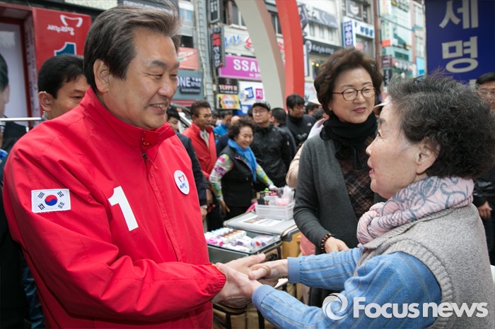 (부산=포커스뉴스) 제20대 총선에서 부산 중구영도에 출마한 김무성 새누리당 대표가 11일 오후 부산 중구 국제시장 앞에서 유세 중, 시민과 악수하고 있다.