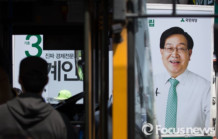 (평택=포커스뉴스) 11일 오후 안산시 평택역 광장 앞에서 국민의당 이계안 평택시을 후보와 최인규 평택시갑 후보가 합동 선거운동을 하고 있는 가운데 버스를 탄 유권자들이 선거 차량에 붙은 선거 포스터를 보고 있다.