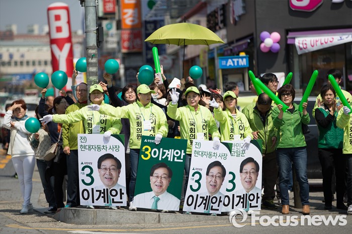 (평택=포커스뉴스) 국민의당 이계안 후보 선거운동원들이 11일 오후 안산시 평택역 광장 앞에서 이계안 평택시을 후보의 지지를 호소하고 있다.