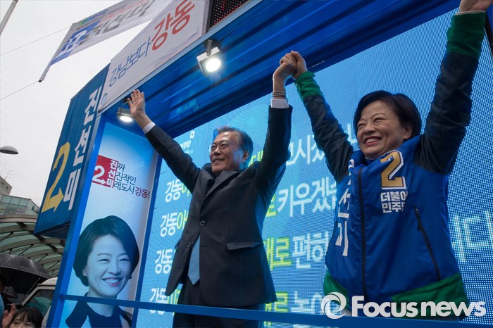 진 의원은 "국회의원으로서 당연한 일을 했을 뿐인데 나를 도와주러 와서 힘이 된다"며 "앞으로도 강동 주민과 대한민국 국민들의 곁에서 힘이되는 정치를 하겠다"는 소감을 밝혔다.선거운동이 시작되고 첫 주말을 맞은 지난 3일 오후 문재인 전 더불어민주당 대표가 서울 강동구 암사시장에서 진선미 더불어민주당 강동구갑 후보와 합동유세를 하고 있다. 2016.04.03 이승배 기자