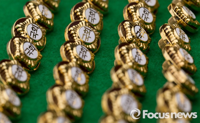 (서울=포커스뉴스) 4.13총선을 이틀 앞둔 11일 오후 서울 여의도 국회에서 20대 국회의원 당선자들이 착용할 배지가 공개되고 있다.