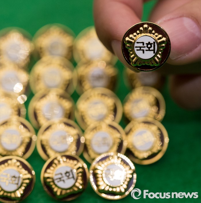 (서울=포커스뉴스) 4.13총선을 이틀 앞둔 11일 오후 서울 여의도 국회에서 20대 국회의원 당선자들이 착용할 배지가 공개되고 있다.