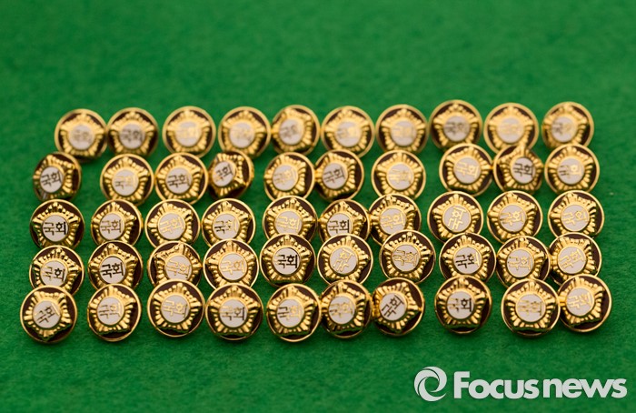 (서울=포커스뉴스) 4.13총선을 이틀 앞둔 11일 오후 서울 여의도 국회에서 20대 국회의원 당선자들이 착용할 배지가 공개되고 있다.