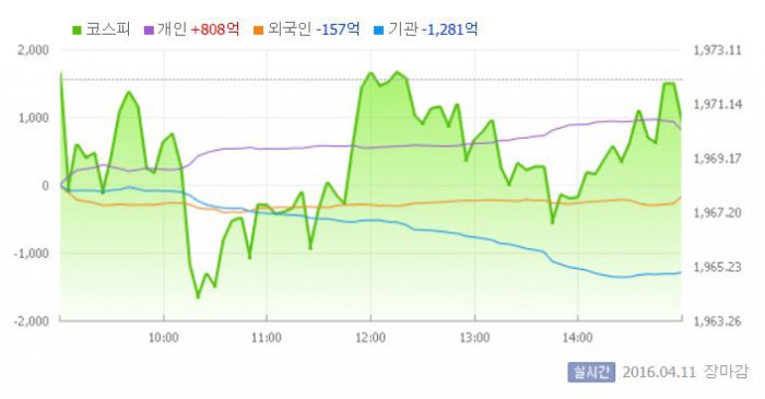 11일 코스피지수는 전거래일 대비 0.09%(1.68포인트) 내린 1970.37에 장을 마쳤다. 코스닥지수는 전거래일 보다 0.59%(4.09포인트) 하락한 693.01에 마감했다.