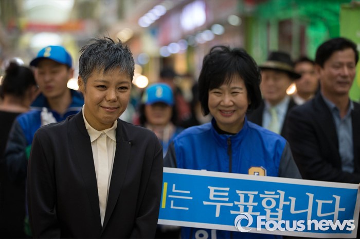 (서울=포커스뉴스) 20대 총선을 이틀 앞둔 11일 오후 서울 마포구 망원시장 일대에서 손혜원 더불어민주당 마포구을 후보가 가수 이은미와 함께 선거유세를 하고 있다.