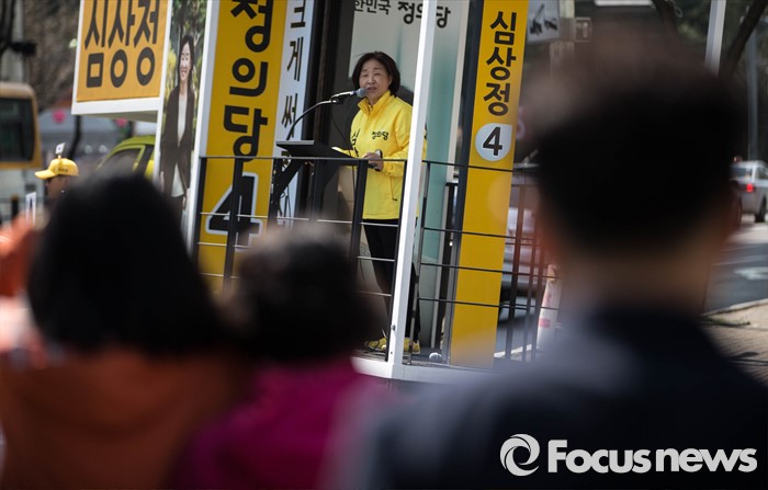(고양=포커스뉴스) 11일 오후 경기도 고양시 덕양구 세이브존 쇼핑몰 앞에서 심상정 정의당 후보가 시민들을 향해 한 표를 호소하고 있다.