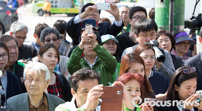 (청주=포커스뉴스) 11일 오후 충북 청주시 사창사거리에서 시민들이안철수 국민의당 대표의 유세를 바라보고 있다.