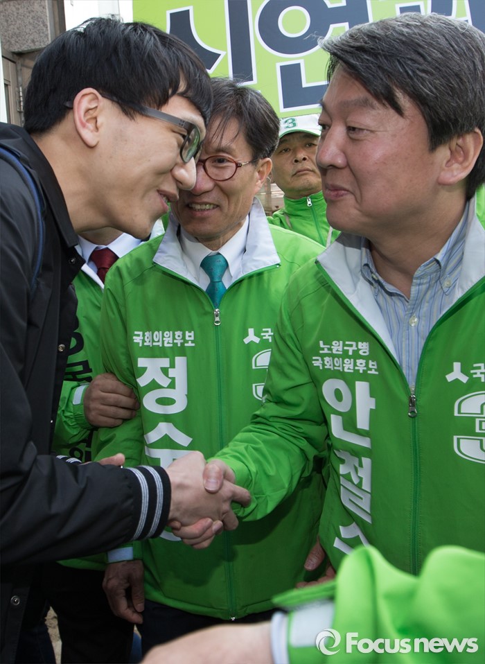(청주=포커스뉴스) 안철수 국민의당 대표가 11일 오후 충북 청주시 사창사거리에서 20대 국회의원 충북도에 출마한 국민의당 후보의 지지를 호소하며 시민들과 악수를 하고 있다.