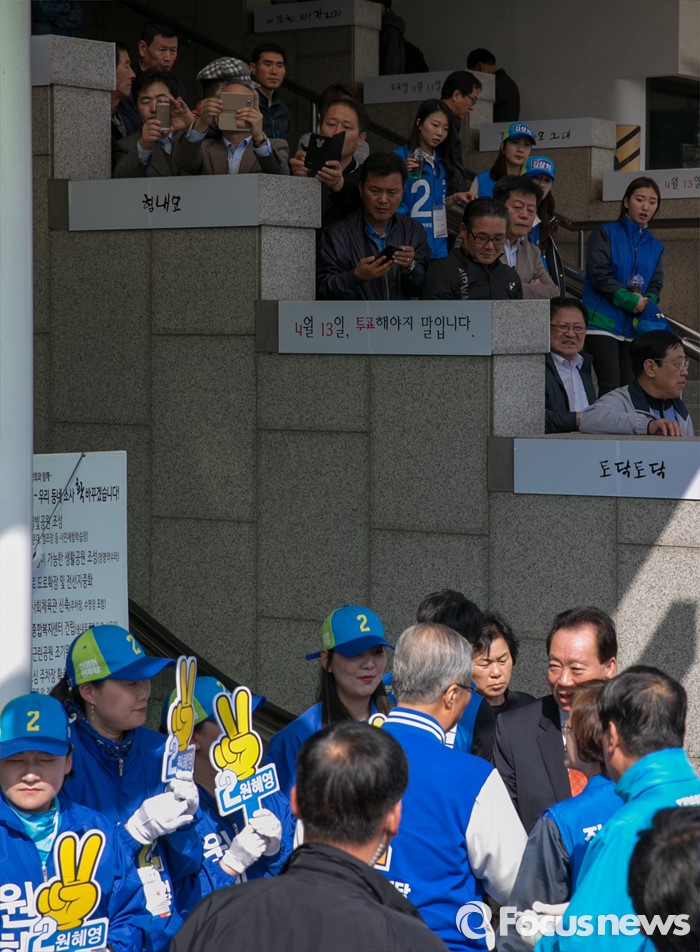 (부천=포커스뉴스) 20대 총선을 이틀 앞둔 11일 오후 경기도 부천역 남부광장에서 열린 더불어민주당 부천지역 합동유세에 참석한 김종인 비대위 대표 겸 선대위원장이 시민 및 지지자들과 인사하고 있다.