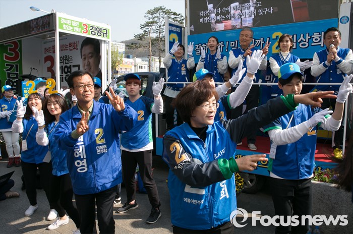 (부천=포커스뉴스) 20대 총선을 이틀 앞둔 11일 오후 경기도 부천역 남부광장에서 열린 더불어민주당 부천지역 합동유세에 참석한 김종인 비대위 대표 겸 선대위원장, 김상희 소사구 후보, 원혜영 오정구 후보 등이 로고송에 맞춰 율동을 선보이고 있다.