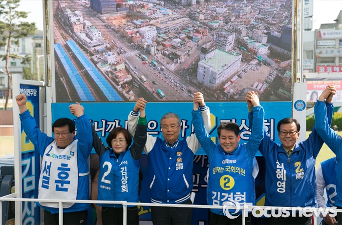 (부천=포커스뉴스) 20대 총선을 이틀 앞둔 11일 오후 경기도 부천역 남부광장에서 열린 더불어민주당 부천지역 합동유세에 참석한 김종인 비대위 대표 겸 선대위원장이 후보들과 함께 지지를 호소하고 있다. 왼쪽부터 설훈 원미을, 김상희 소사구 후보 ,김 대표, 김경협 원미갑, 원혜영 오정구 후보.