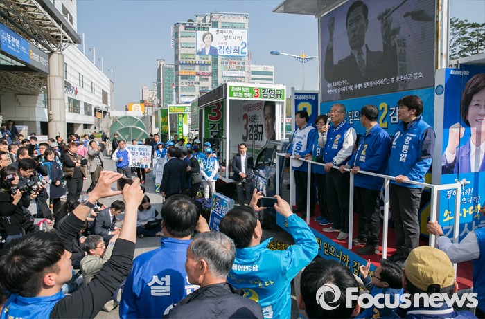 (부천=포커스뉴스) 20대 총선을 이틀 앞둔 11일 오후 경기도 부천역 남부광장에서 열린 더불어민주당 부천지역 합동유세에 참석한 김종인 비대위 대표 겸 선대위원장이 지지를 호소하고 있다.