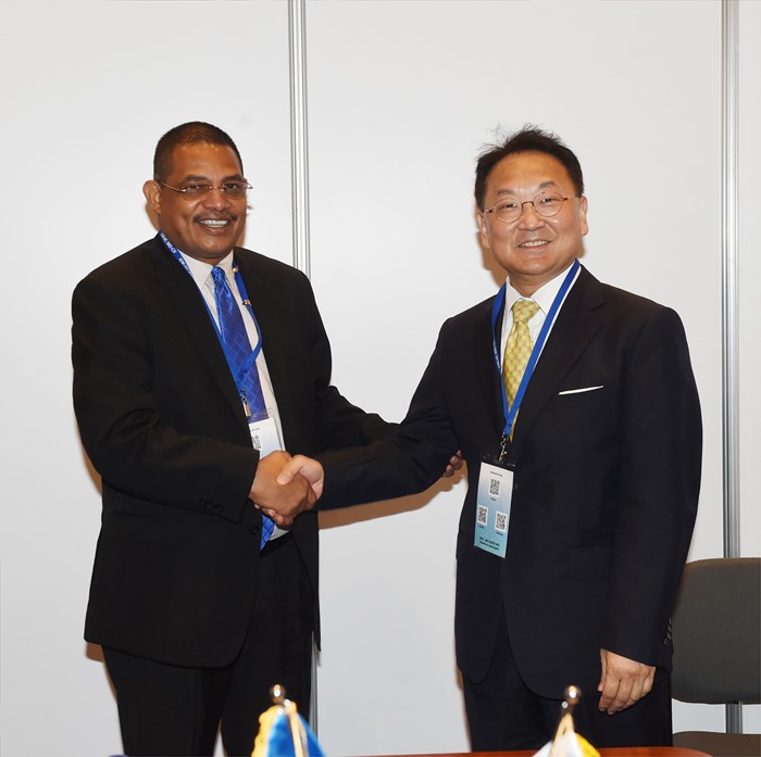 (서울=포커스뉴스) 2016년 IDB 연차총회 참석차 바하마 낫쏘를 방문중인 유일호 부총리 겸 기획재정부 장관이 10일(현지시간) 아코스타 몬딸반 니카라과 재무장관과 양자회담에 앞서 기념촬영을 하고 있다. <사진제공=기획재정부>